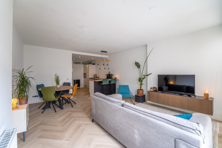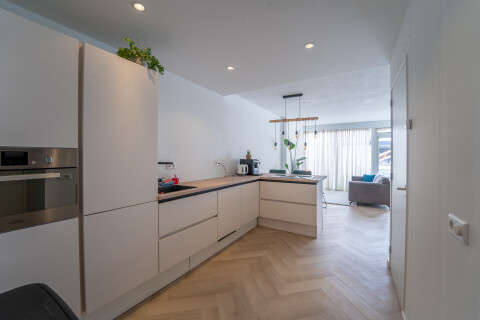 Modern appartement 55m2 met tuin. Ruime woonkamer met open keuken, slaapkamer, badkamer, toilet en opberghok/wasruimte met droger/wasmachine aansluiting